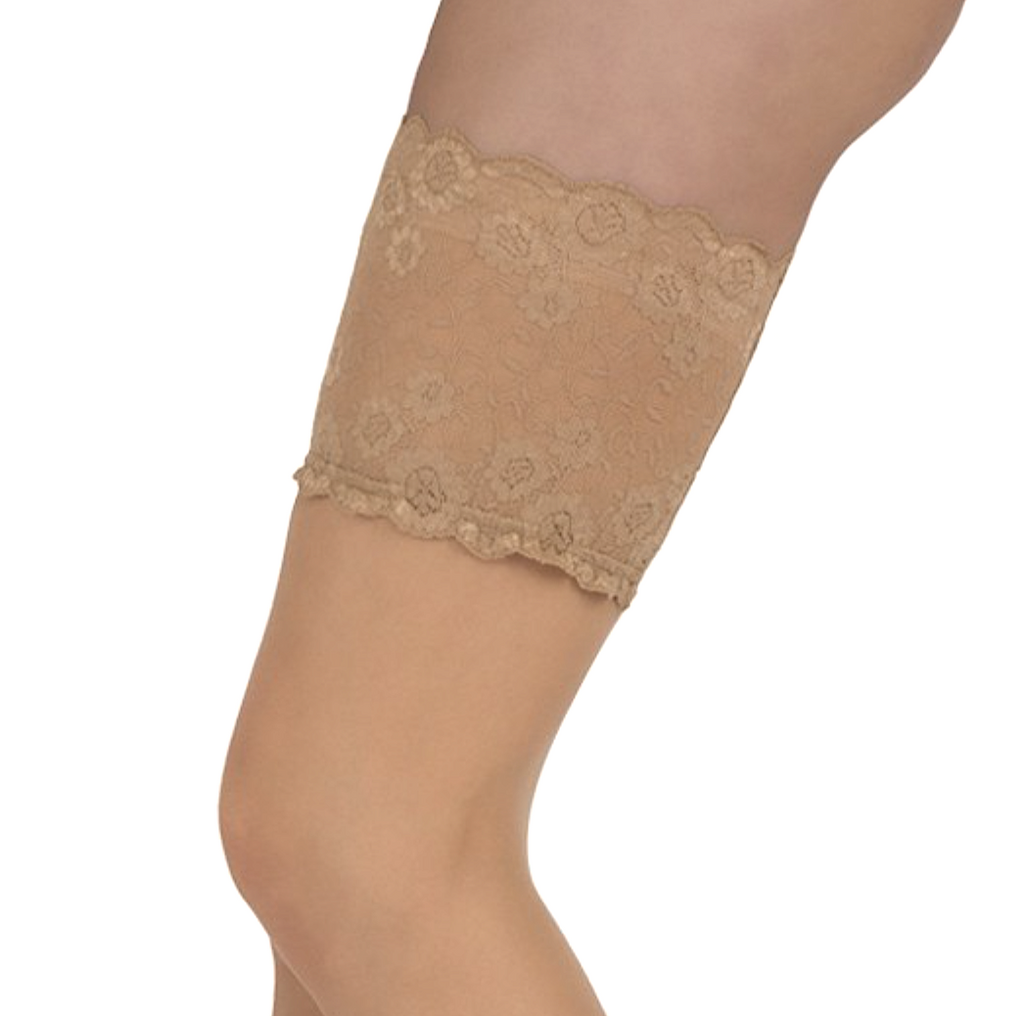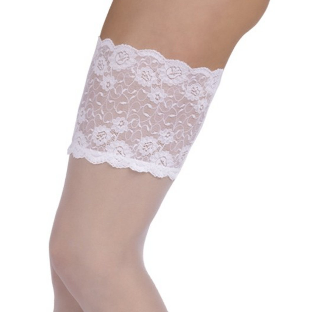 15 Denier hold ups with Lycra, Deep lace band with silicone, flat seams, slightly re-enforced toes.