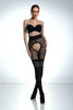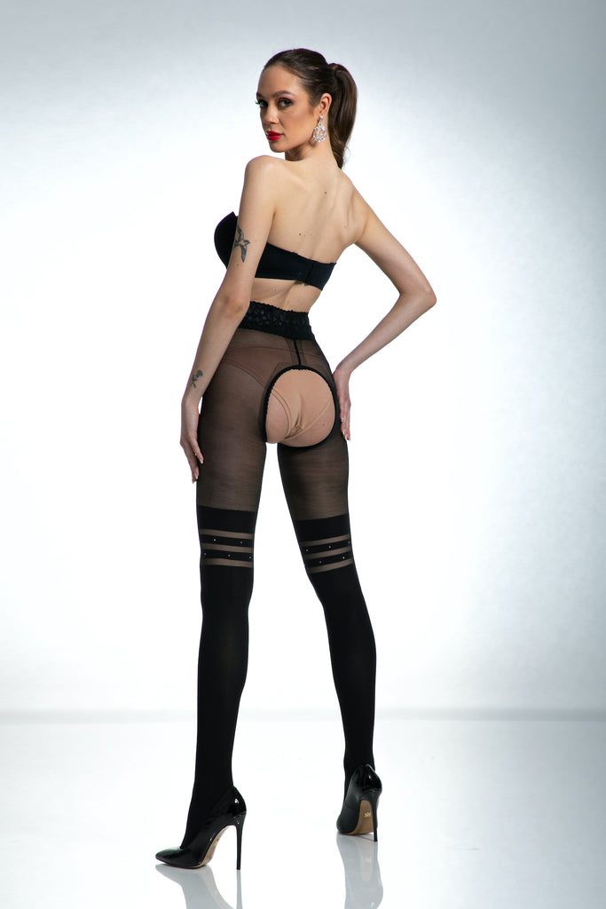 Spectacular open crotch tights for the modern goddess of love. Hand studded with crystals around the thigh. The jewellery effect gives exclusivity and sophistication, a perfect addition to evening outfits. The upper part is finished with a lace waistband covered with silicone. The product is made of Italian yarns of the highest quality.