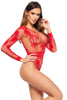 Sexy bodysuit in red colour for lovers of comfortable and provocative underwear. The fishnet pattern with large eyelets is complemented by scattered flowers and a belt at the waist. The bodysuit can be worn on both sides, depending on your preference - with a strap between the bust or on the back. Long sleeves with thicker ruffles. A practical opening in the crotch.